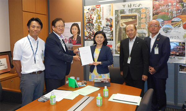 牧島かれん衆議院議員に要望書を手渡す湯川会長(左から2番目)